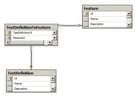 在DB中,testDefinition到feature是由多到多的连接表。