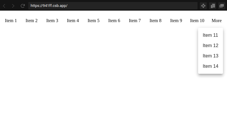 我用MUI列表创建了逻辑,你可以用MUI选项卡定制它。我计算所有项目的宽度和检查我们是否有足够的空间,如果没有,我增加了更多的按钮和下拉,其余的在里面。请注意,如果项的宽度或长度发生更改,则现在不进行重新计算。