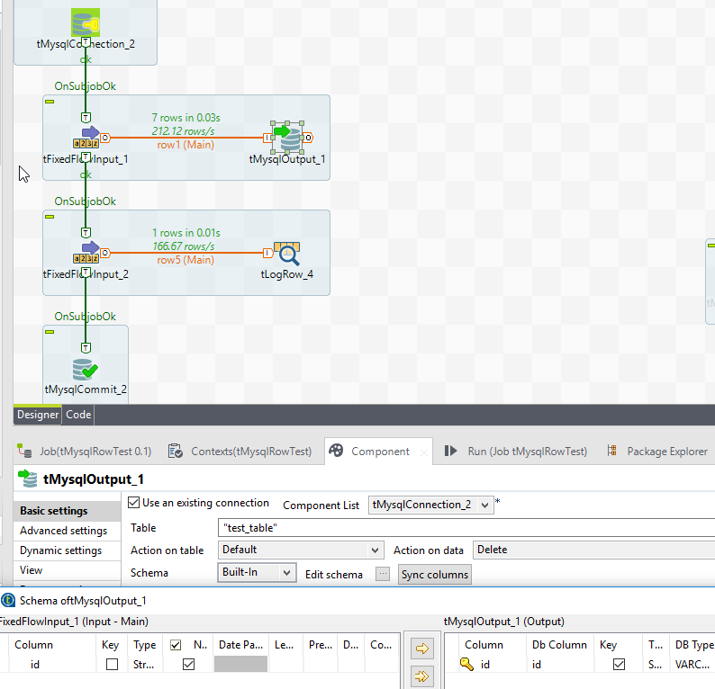 下面是另一种解决方案,在该解决方案中,我发送一个ID列表(在tFixedFlowInput中定义,但很可能从file..etc中读取)删除到tMysqlOutput (对数据集的操作设置为Delete),并将id列设置为组件模式中的键: