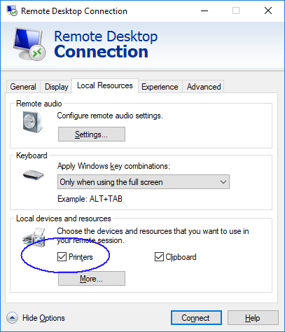 当您启动RDP客户端时,您可以禁用远程系统的“功能”,以便能够使用本地打印机来运行在该远程服务器上的软件。更糟糕的是,您的本地会话可能在您的网络上有几台打印机--因此整个过程可能需要相当长的时间--而且速度可能相当慢。