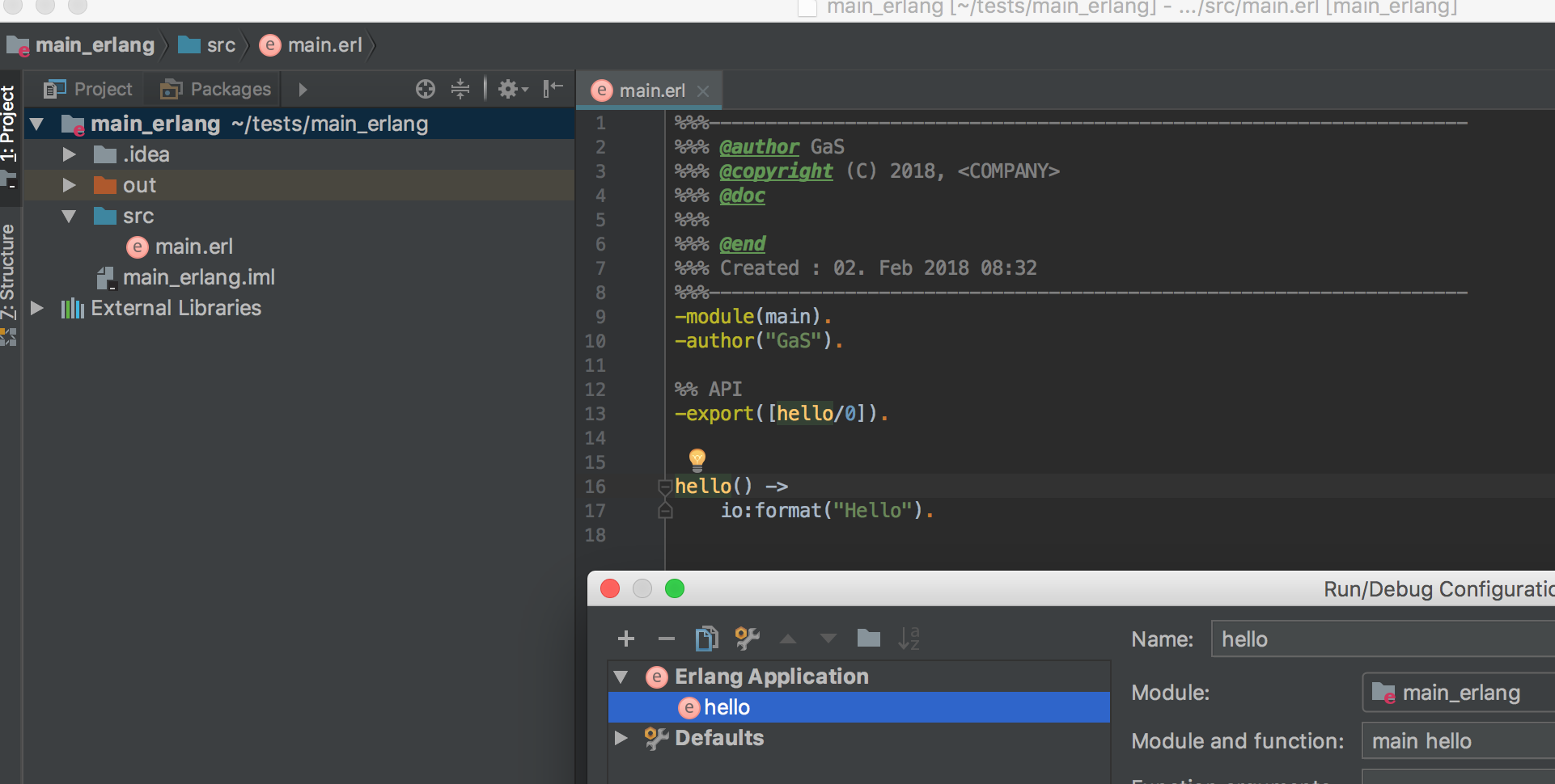试图在intellij idea中运行一个简单的erlang,方法是在线执行大多数指令,但模块名失败(单击以查看图像)