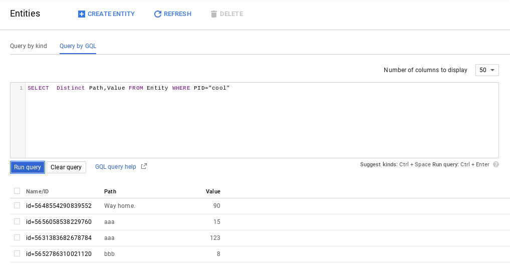 显示绿色滴答后,索引就可以提供了,您可以使用GQL查询数据存储内容: