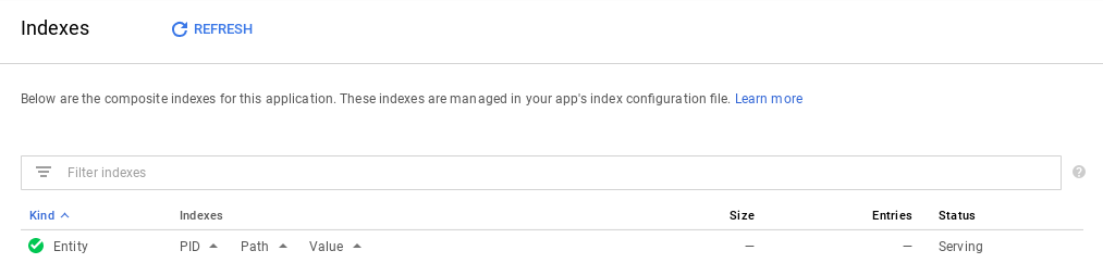 gcloud datastore create-indexes index.yaml加载将需要一段时间,但一旦准备就绪,您将能够在Datastore > Indexes tab in the Console中找到它。