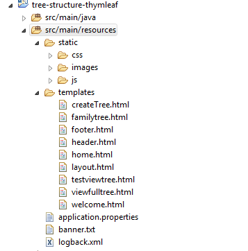 我是新来的羊叶模板引擎。我有一个弹簧引导web应用程序,使用他们的叶模板引擎。下面是我的项目结构。
