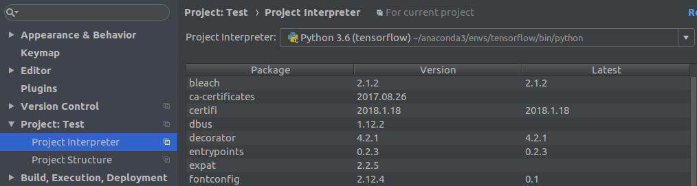File -> Settings -> Project Interpreter (在Project: Test下面)home/user/anaconda3/envs/tensorflow/bin/python设置下面的路径