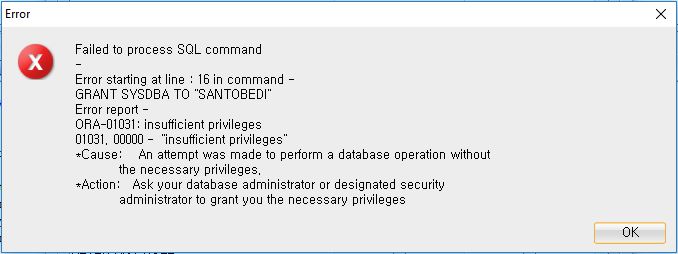 我遵循这和这链接,使用命令提示符将sysdba权限授予新用户。我可以将sysdba授予这个新用户。但是,当我尝试从Oracle sql开发人员授予所有系统权限时,我会得到相同的错误(在上面的屏幕快照中指定)。我试图将所有系统权限授予新用户,因为在访问数据库的表时,我会得到以下错误。