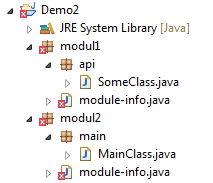 要理解这个设计决策,请考虑Java模块对应于OSGi包/Eclipse插件,并且始终为每个包/插件有一个单独的项目。如果您来自Maven世界,则可能需要更深的文件夹结构。但是模块是独立的,将几个模块合并到一个项目中只会增加一个额外的文件夹级别,而没有意义。但是,如果需要额外的文件夹级别,Eclipse支持嵌套项目和所谓的工作集。
