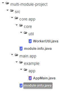 正如您所看到的,这是一个来自官方分级指南的演示项目,它有多个模块。每个模块都有自己的module-info.java。