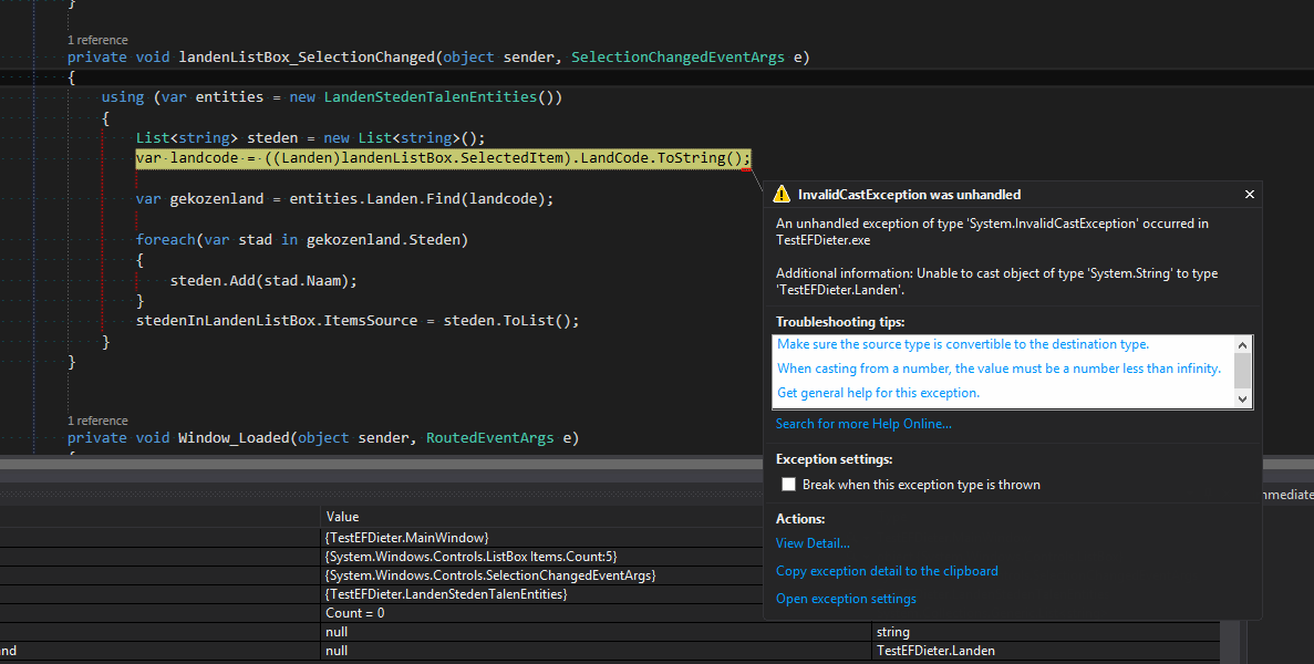 无法将“System.String”类型的对象强制转换为“TestEFDieter.Landen”。