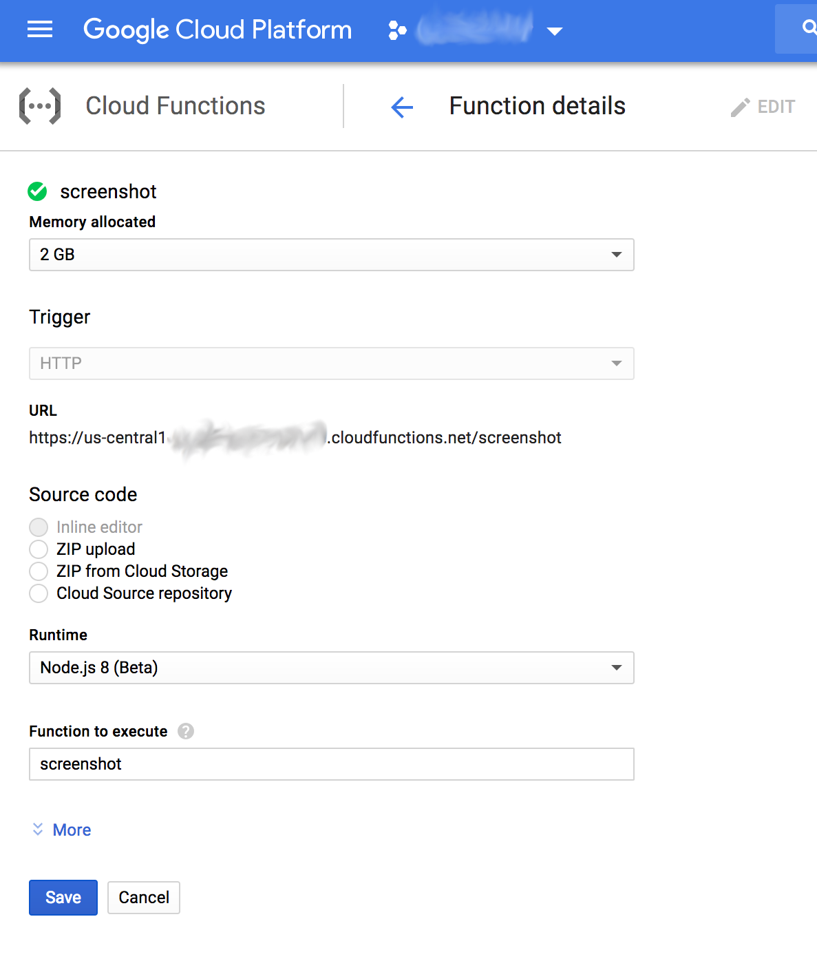 gcloud beta functions deploy screenshot --runtime nodejs8 --trigger-http4)最后,您需要增加内存分配。默认情况下,云函数只获得256 By内存,因此,如果您尝试运行Puppeteer而不首先更改内存设置,您将得到一个错误。在云控制台中打开您的项目,选择Cloud,选择您的函数,然后单击编辑。512 me对我来说是不够的,所以我提高到了2Gb。
