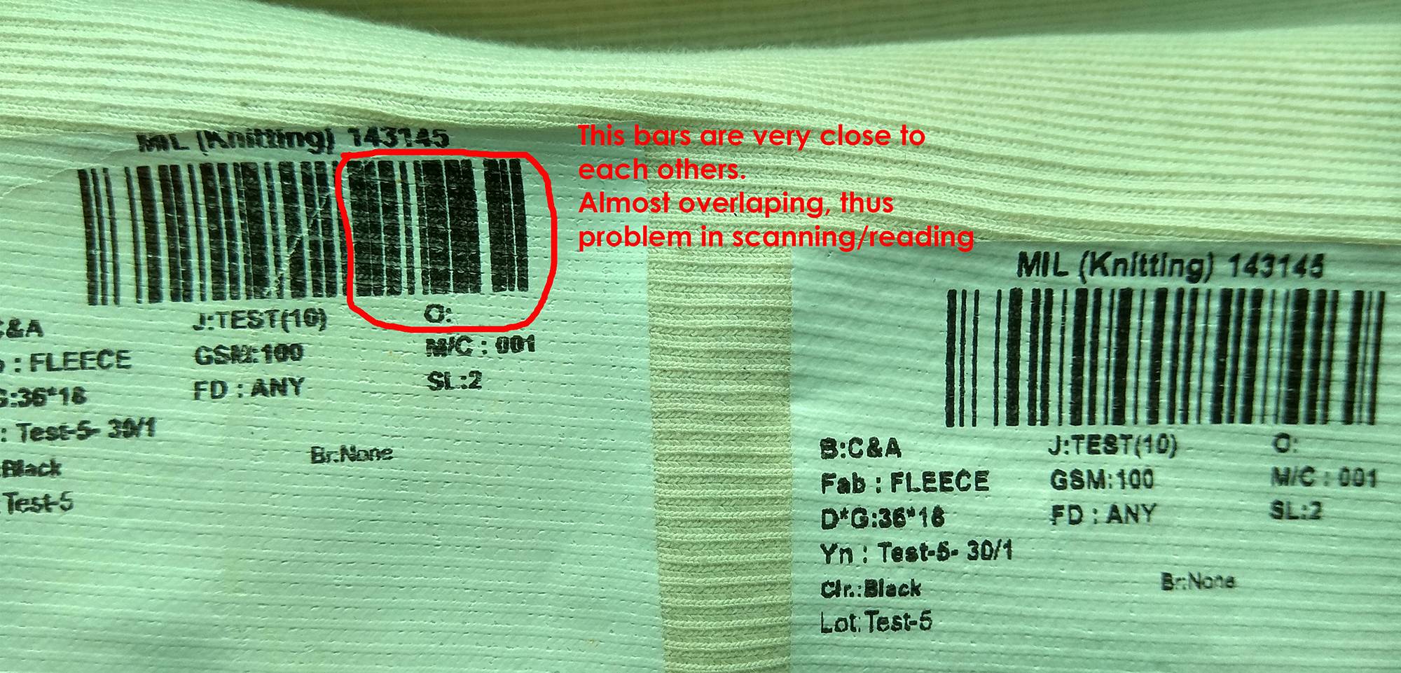 现在的问题是,条形码条变得非常拥挤,而连接到织物的身体。我已经把问题地区圈起来了。