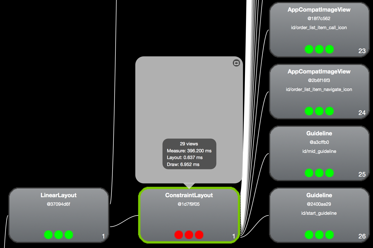 </android.support.constraint.ConstraintLayout>这是问题的证据。所有子视图的测量时间都在0.1ms左右。