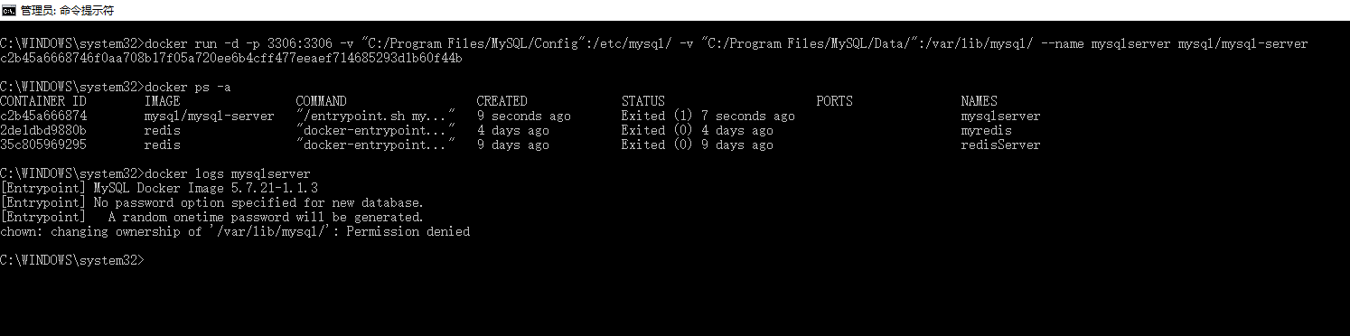 C:\WINDOWS\system32>docker run -d -p 3306:3306 -v "C:/Program Files/MySQL/Config":/etc/mysql/ -v "C:/Program Files/MySQL/Data/":/var/lib/mysql/ --name mysqlserver mysql/mysql-server
