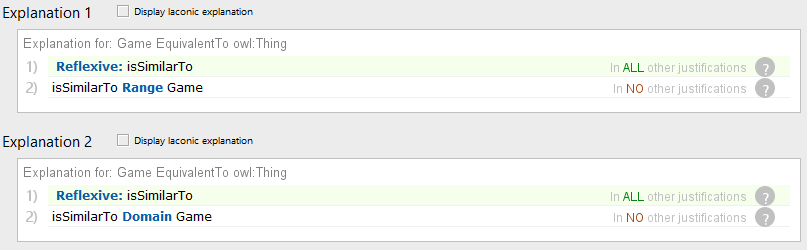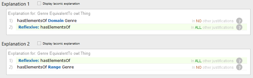 正如您可能认为的那样,这肯定不是我所期望的结果。我已经尝试过设置Game Disjoint With Genre,但是推理者随后声明本体是不一致的。它给出的解释与对Game Equivalent To Genre的解释相同,但在每个解释中都添加了Disjoint With限制。