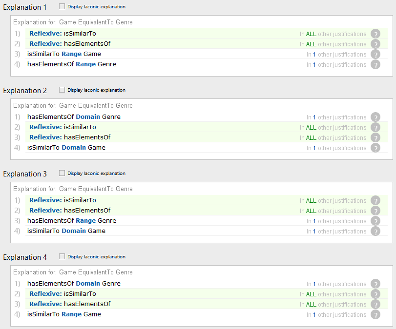 当我在Protégé启动“HermiT推理者”时,它说Game是Equivalent To Genre,并给出了解释: