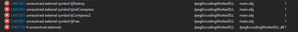 第一个问题,您可以通过链接到_snprintf_s来消除未解决的legacy_stdio_definitions.lib符号错误。但是,第二个错误(“未解决的外部符号__iob_func")并不容易解决。这是由于微软最近推出的新的“通用C运行时”库(ucrt)。不幸的是,新的库引入了一些与以前的Microsoft CRT相当严重的不兼容。 提到http://www.libjpeg-turbo.org/Documentation/OfficialBinaries,在libjpeg-turbo中永远不可能完全隔离CRT,因为libjpeg API函数(jpeg_stdio_dest()和jpeg_stdio_src())需要将文件句柄从调用程序传递到库。如果libjpeg API库被用作DLL ( jpeg62.dll ),则调用程序必须与jpeg62.dll共享相同的CRT DLL,否则将文件句柄从一个传递到另一个不能工作(文件指针将指向应用程序或DLL内存空间中的不透明结构,因此指针对另一个没有意义)。 传统上,与静态libjpeg-turbo库链接是可能的,即使使用与编译库所用的不同版本的VisualC++,但显然这从未被支持(https://connect.microsoft.com/VisualStudio/feedback/details/1144980/error-lnk2001-unresolved-external-symbol-imp-iob-func),只是因为不同版本的C++中的C++相当相似。很明显,所有这些都是在引入ucrt之后从窗口消失的。谷歌的错误信息显示,我们并不是唯一的OSS项目遭受这种痛苦。 目前,这是我所知道的唯一的解决办法: