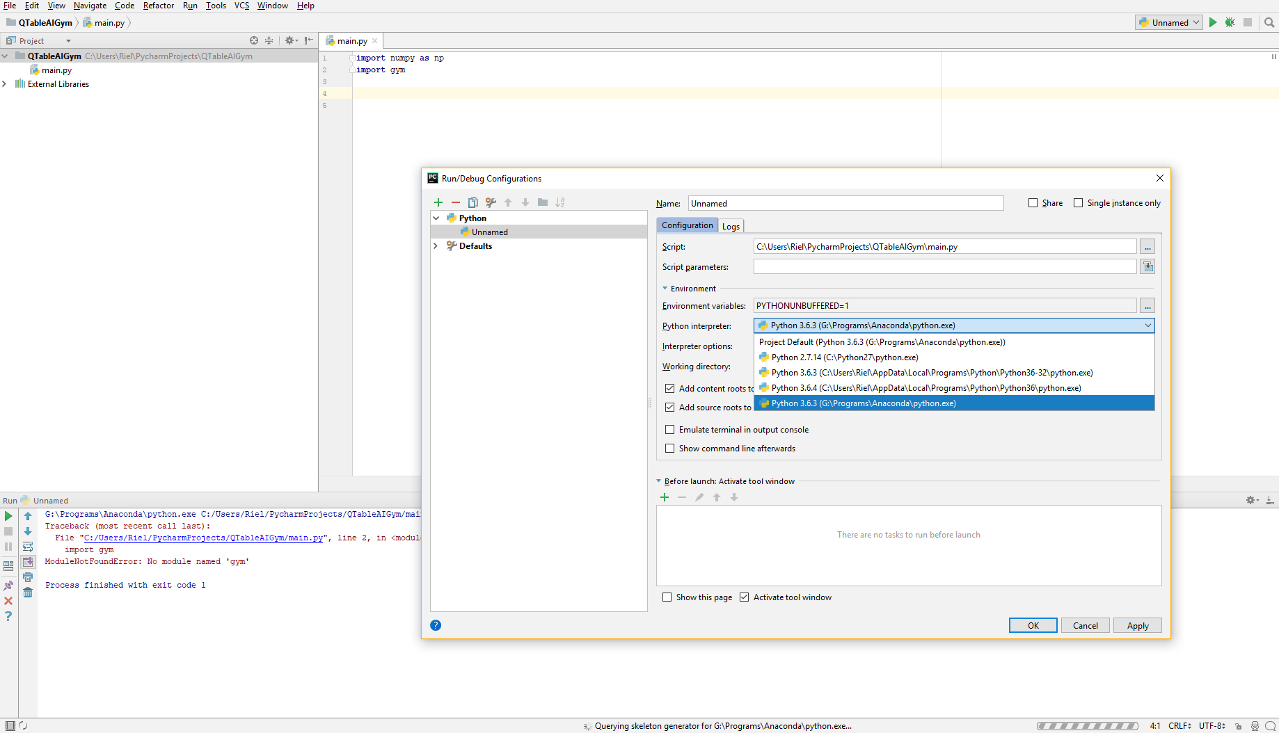 然而,在pyCharm中,尽管我确信我已经为该项目选择了Anaconda解释器,但它还是不起作用。