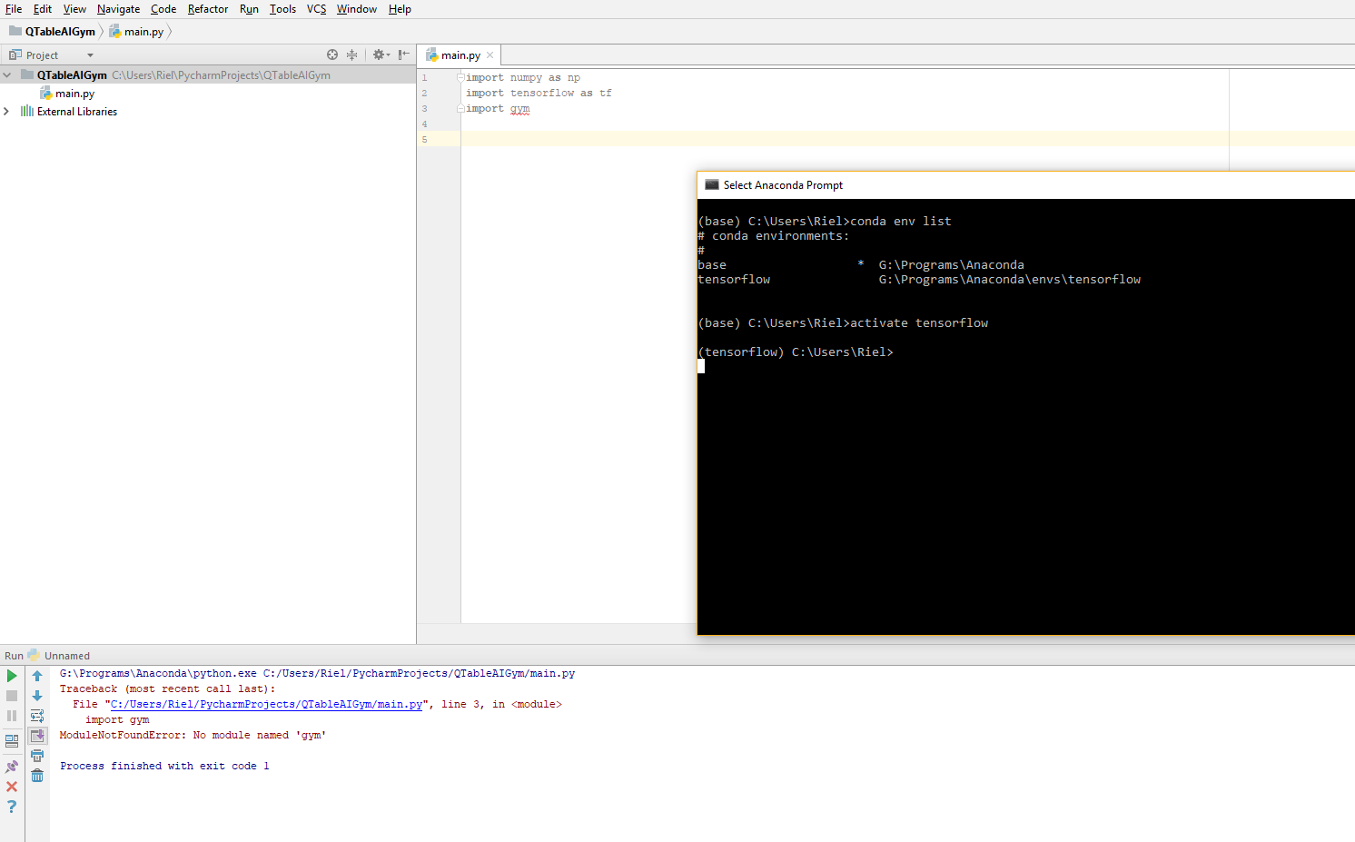 (tensorflow) C:\Users\Riel> conda env list它将打印已安装的Anaconda环境及其位置的列表。找到您的tensorflow环境并将其添加到PyCharm中。