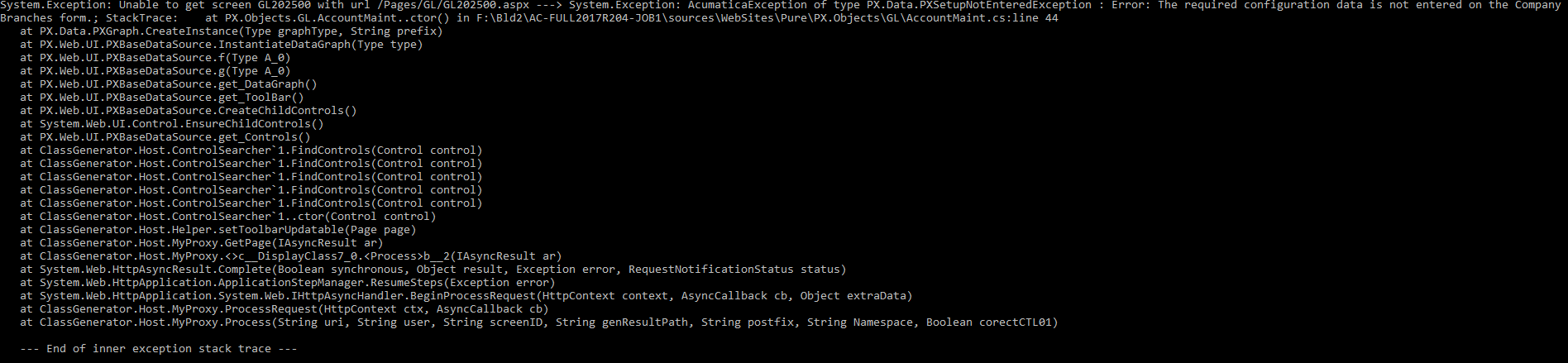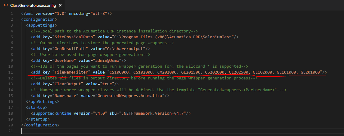 我目前正在使用Acumatica中的Selenium进行一些自动化测试。我在用SDK版本文档: 17.204.0019。当我试图像文档中描述的那样生成包装类时,它只为ClassGenerator.exe文件中引用的8页中的5页生成包装类: