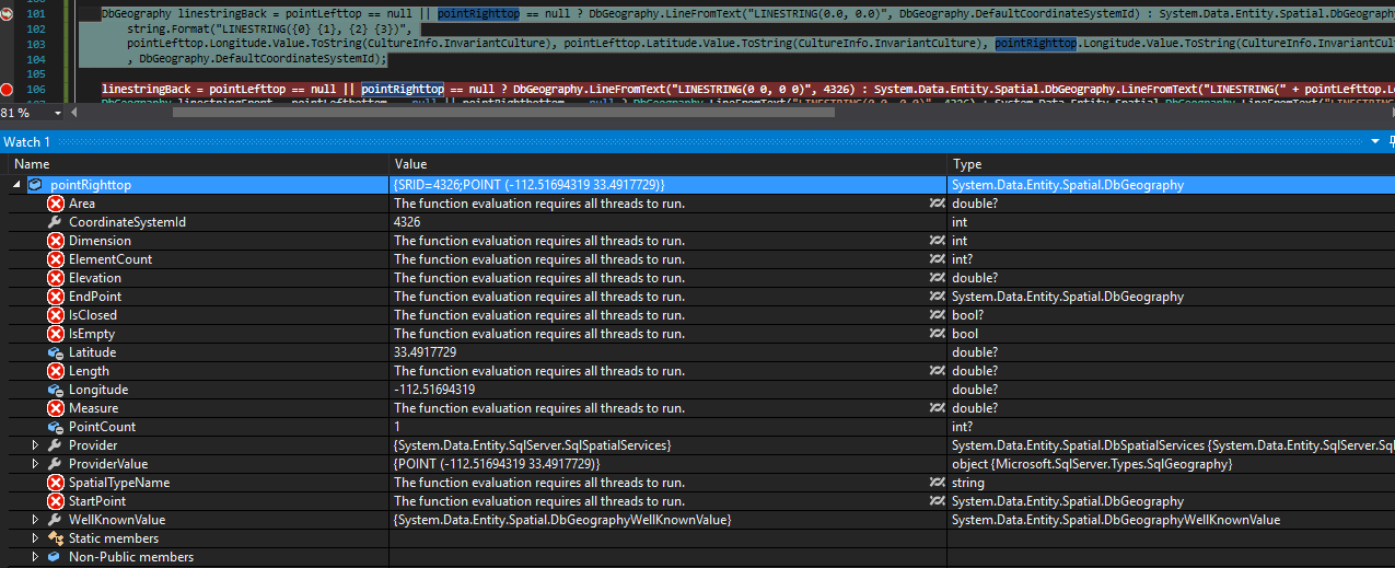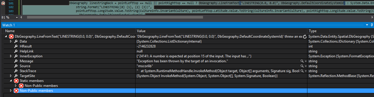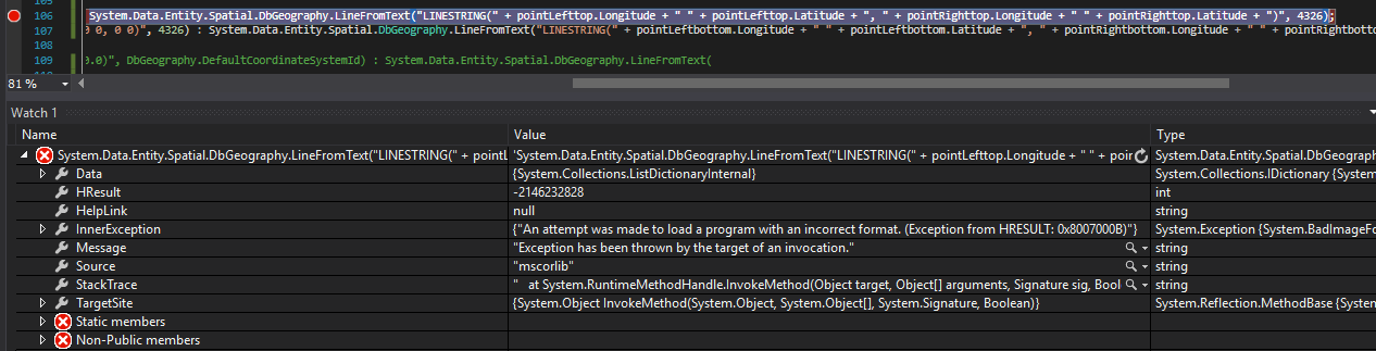 DbGeography linestringBack = pointLefttop == null || pointRighttop == null ? DbGeography.LineFromText("LINESTRING(0 0, 0 0)", 4326) : System.Data.Entity.Spatial.DbGeography.LineFromText("LINESTRING(" + pointLefttop.Longitude + " " + pointLefttop.Latitude + ", " + pointRighttop.Longitude + " " + pointRighttop.Latitude + ")", 4326);其中h.GreenPoly有值{SRID=4326;POLYGON ((-112.51643746 33.49170131, -112.51694319 33.4917729, -112.51685776 33.49219669, -112.51635201 33.49212509, -112.51643746 33.49170131))},并且它的类型是System.Data.Entity.Spatial.DbGeography