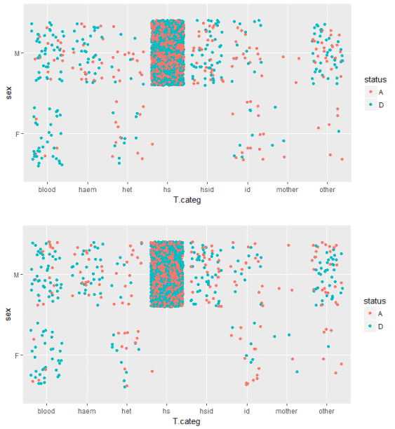geom_jitter(aes(T.categ, sex, colour = status))它显示了一张图表。但是每次我运行代码时,它似乎都会生成一个不同的图表。这是其中的两个放在一起的。