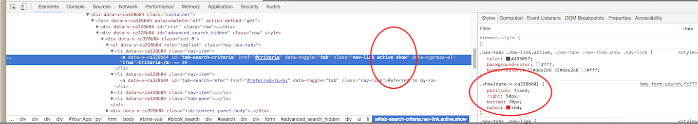 但是我很确定我没有把它放在那里,所以想知道Bootstra4现在是否添加了.show和.active。这里有记录吗?如果是这样的话,我需要避免css类名冲突,在我的例子中,将Vue组件的嵌入式css更改为.show2使我的问题暂时消失了。