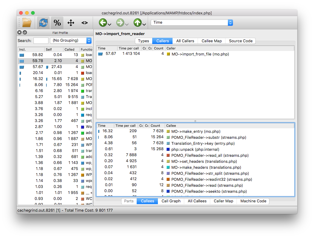 您不能重写WordPress函数。他们用的时间和时间一样长。但是也许您可以改进磁盘I/O,钻入MO::import_from_reader方法,看起来大约40%的时间是在PHP代码之外花费的(可能是读取打开的文件)。一个提供SSD的托管提供商可能会给你提振,但我已经达到了。我认为缓存是最好的方法。