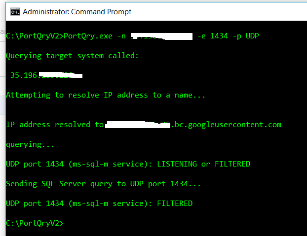 当我运行PortQry时,它告诉我,端口1434和1433是经过过滤的,即使防火墙是禁用的。这让我感到困惑,也许我不明白PortQry的输出。