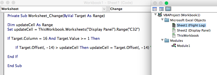 End Sub Flight Log工作表代码窗格中的代码: