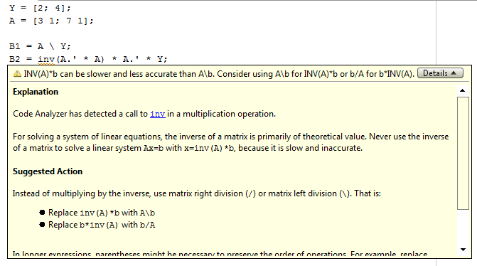 0.5您所看到的细微差别是由于INV(A) * b比A \ b精度低,如果您悬停对inv函数的调用,然后再加上乘法(应该用橙色警告高亮显示),即使是Matlab代码解释器也会清楚地说明这一点: