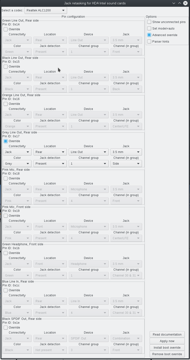 我发现,hdajackretask作为Debian上的alsa-tools-gui包的一部分,在使声卡的内部部分符合我所需的配置方面,看起来非常有趣。