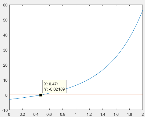g = @(x) (exp(2*x)+3*x-4); % You previously omitted the 2nd 'x', meaning g(x)=exp(2*x)-12您的代码中的最后一个错误,您必须已经修复了,否则您就不会达到无限循环的程度,这就是应该使用-时xu定义中的=。