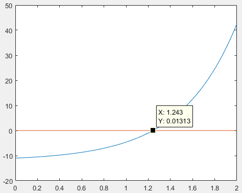 xm = (xl+xu)/2;% xm是xl和xm的中点(或平均值)你说你知道结果应该是0.5,但是一个快速的图可以证明它应该接近1.24,正如上面的校正所示(给出了一个结果1.2425)。