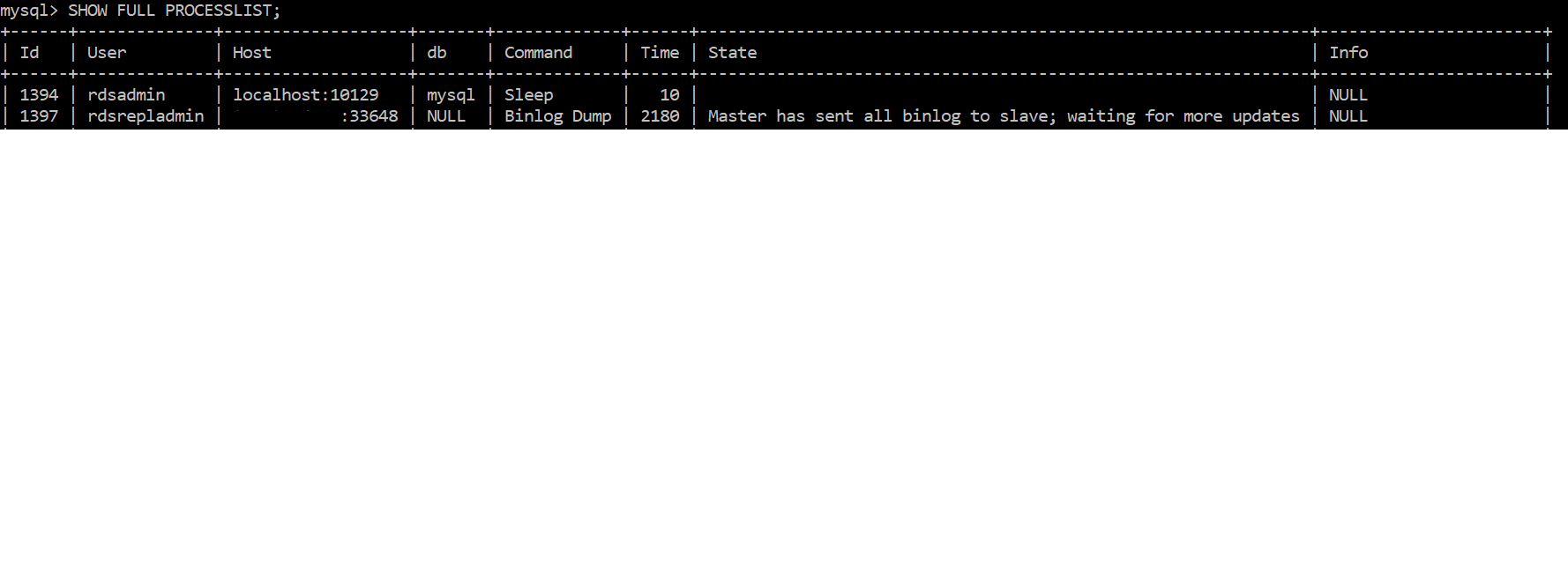 2.1)停止MyISAM表的所有活动(即关闭所有会话)。可以通过对从mysql.rds_kill命令返回的每个进程调用SHOW FULL PROCESSLIST命令来关闭所有会话。