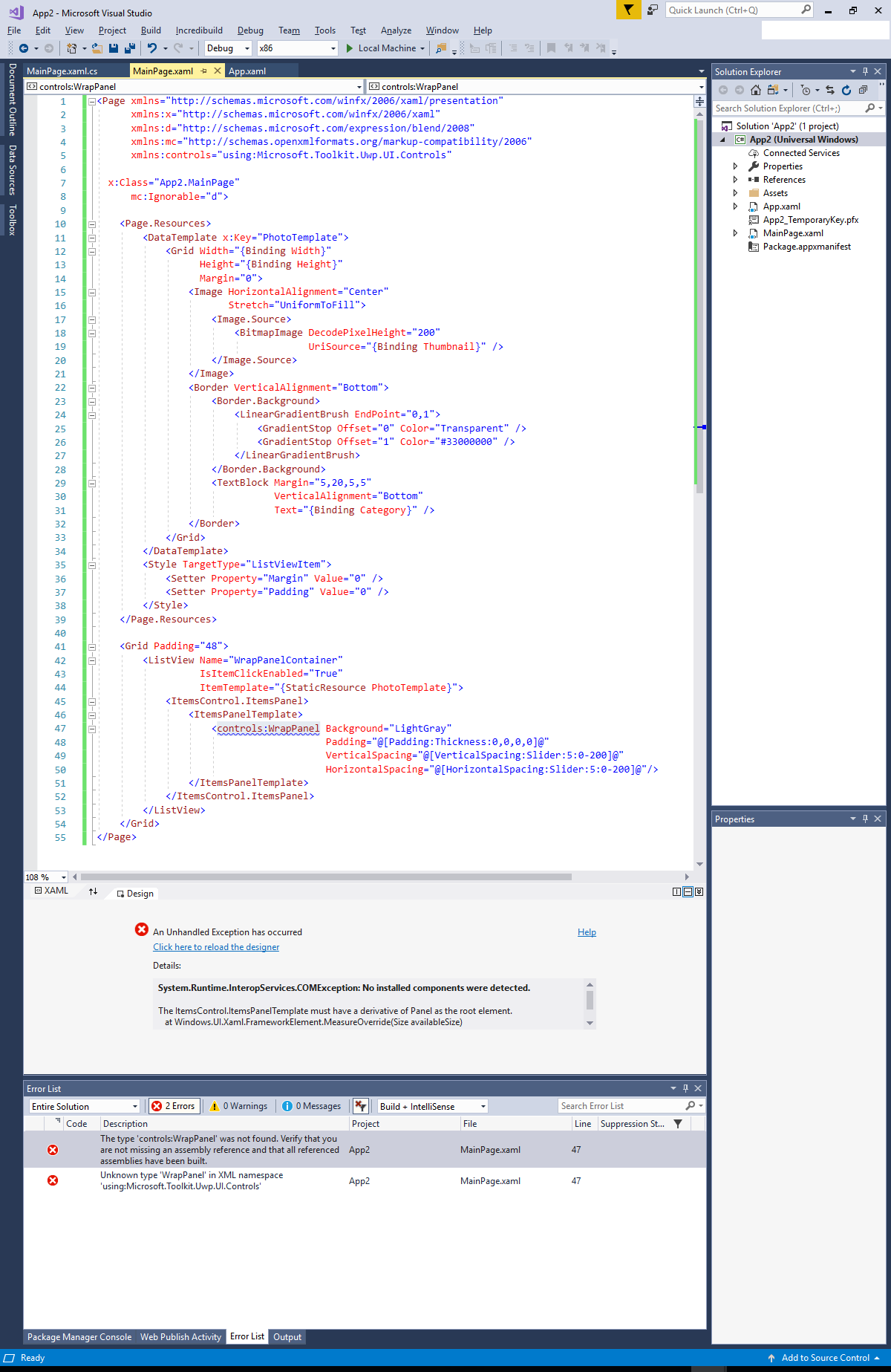 我在wrapPanel:WrapPanel上得到以下错误消息