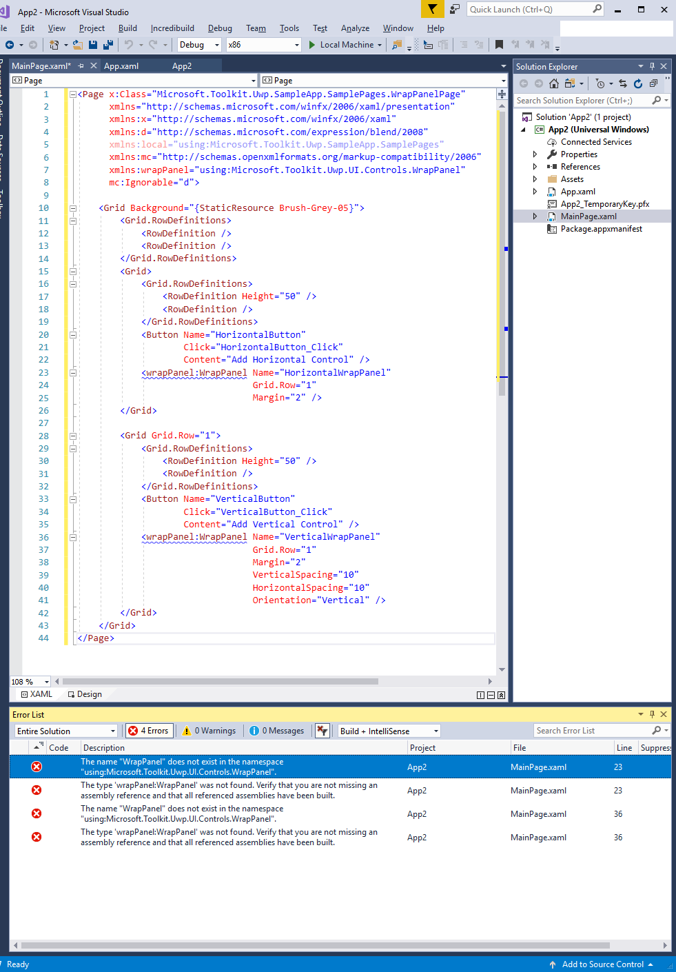 我创建了一个新的空白Windows10Universal应用程序,并试图按照链接:WrapPanel中的示例代码添加一个WrapPanel XAML控制