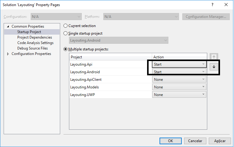 关于多个启动项目,我从来没有遇到过更多“服务器项目”的问题,我尝试在解决方案中添加一个简单的Android应用程序,即使它在单独启动时正确工作,但当我尝试与其他项目一起运行它时,它也不起作用。