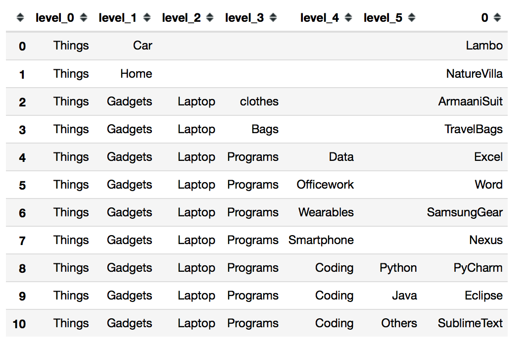解决您的任务的一个简单方法是:提取第二级数据,提取第三级数据,等等,然后将它们组合在一起。例如,要提取第二级值,可以编写如下内容:
