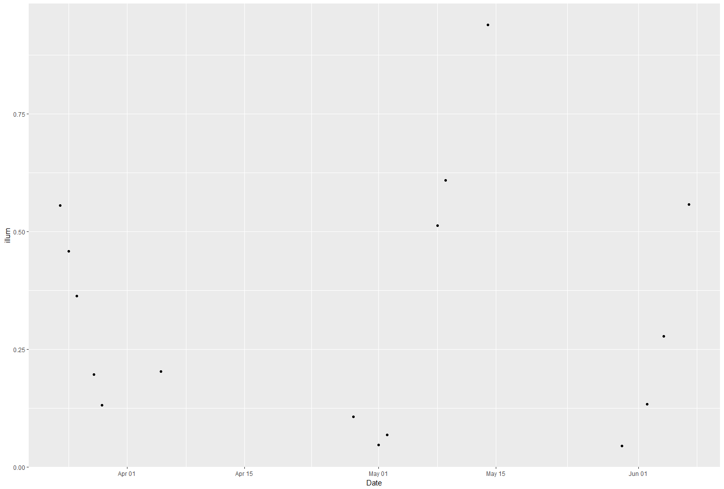 我有渔业数据集( 样本数据集)。我要研究月亮对鱼的影响。我用月球包裹来找出每个捕鱼日的月相。