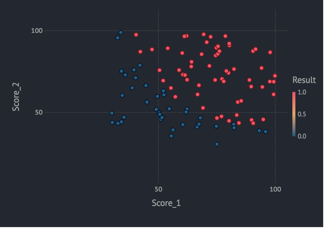 我有一个由两个科目的学生分数组成的数据集,以及该学生是否被大学录取的结果。我需要对数据进行logistic回归,并找到最优参数θ,以最小化损失,并对测试数据进行预测。我不想在这里建立任何复杂的非线性网络。