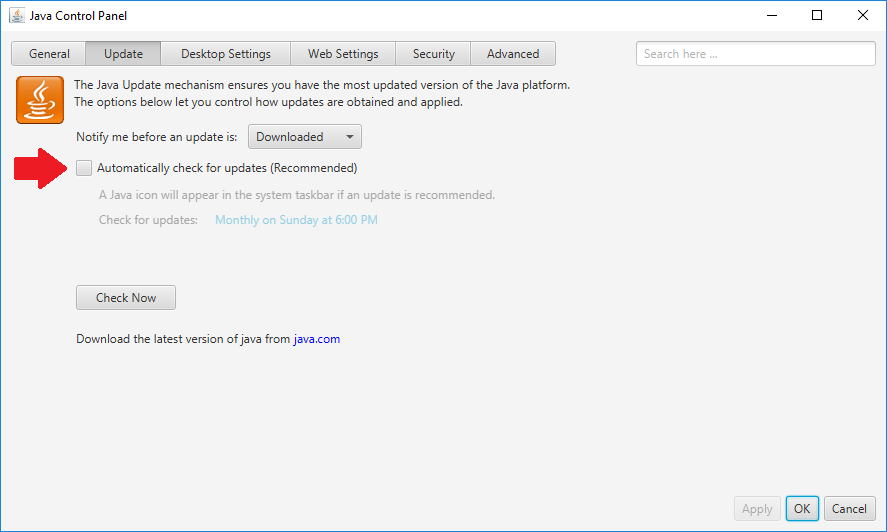 在Java (您可以从Windows获得)中,导航到Update选项卡,并验证Automatically check for updates (Recommended)是未选中的,如下图所示。