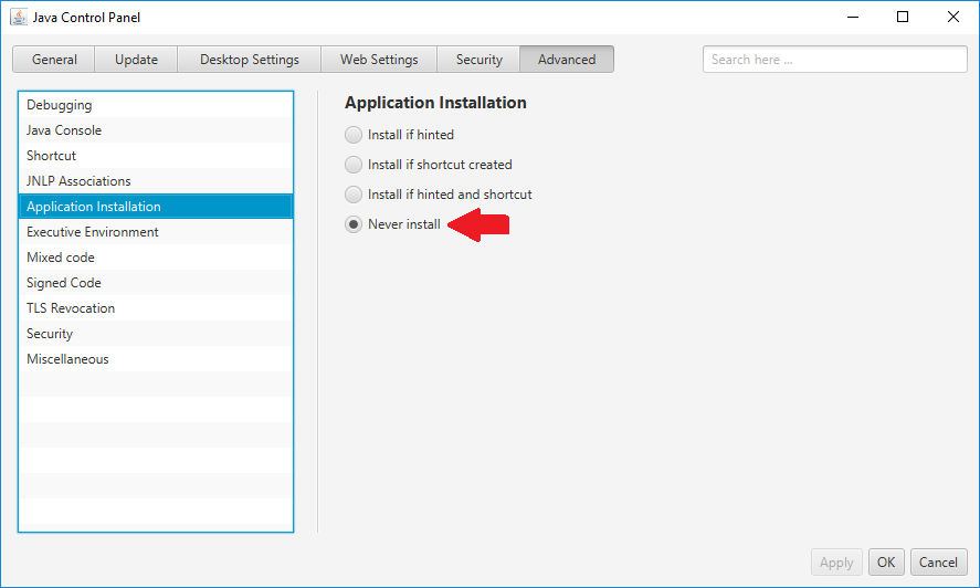 接下来,导航到Advanced选项卡并选择Application Installation子选项卡。验证Never install单选按钮是否勾选了,如下图所示。