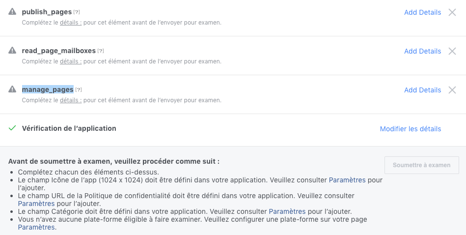 你需要得到facebook的特别许可才能在你的应用程序中使用这些权限。单击每个权限旁边的“Add”,然后用所需的用例场景正确地填充表单。然后将应用程序提交给facebook进行应用程序审查。几天后,您的应用程序和机器人应该得到验证,如果一切都好。