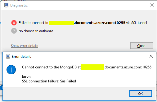 这是我得到的错误:SSL连接失败: SaslFailed