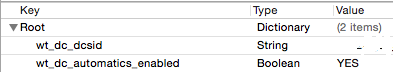 值得注意的是,如果我从plist文件中删除wt_dc_automatics_enabled / wt_dc_enabled,该项目运行良好,尽管据我所知,它没有发送任何日志。