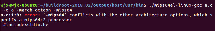 我使用buildroot201802作为交叉编译工具。当我用mips64el-linux-gcc *.c -march=octeon -mips64编译时