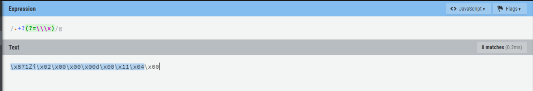 您可以对javascript使用以下regex:.+?(?=\\\x|$)