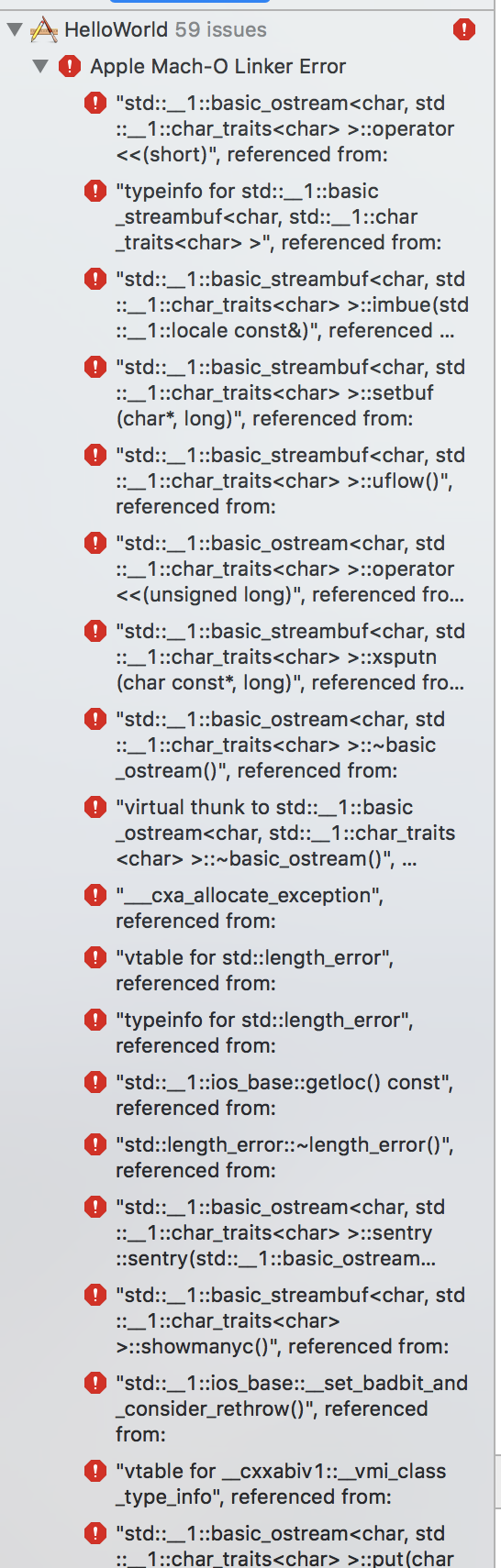 使这些错误消失的最简单方法是在Xcode中的目标设置中添加-lstdc++链接器标志(在“其他链接器标志”下)。