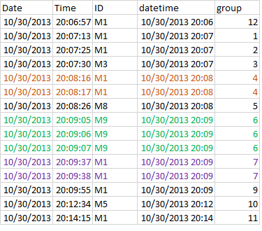 structure(list(Date = c("10/30/2013", "10/30/2013", "10/30/2013", "10/30/2013", "10/30/2013", "10/30/2013", "10/30/2013", "10/30/2013", "10/30/2013", "10/30/2013", "10/30/2013", "10/30/2013", "10/30/2013", "10/30/2013", "10/30/2013"), Time = c("20:06:57", "20:07:13", "20:07:25", "20:07:30", "20:08:16", "20:08:17", "20:08:26", "20:09:05", "20:09:06", "20:09:07", "20:09:37", "20:09:38", "20:09:55", "20:12:34", "20:14:15"), ID = c("M1", "M1", "M1", "M3", "M1", "M1", "M8", "M9", "M9", "M9", "M1", "M1", "M1", "M5", "M1")), .Names = c("Date", "Time", "ID"), class = "data.frame", row.names = c(NA, -15L))
