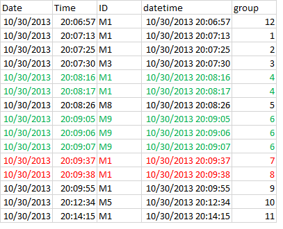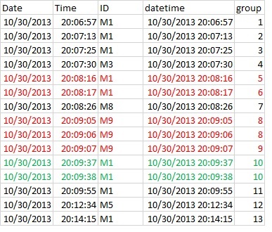 #15 10/30/2013 20:14:15 M1 2013-10-30 20:14:15 11说明:计算两个连续的datetime条目之间的时间差,按ID分组;group则是所有时间差>=5的累积和。